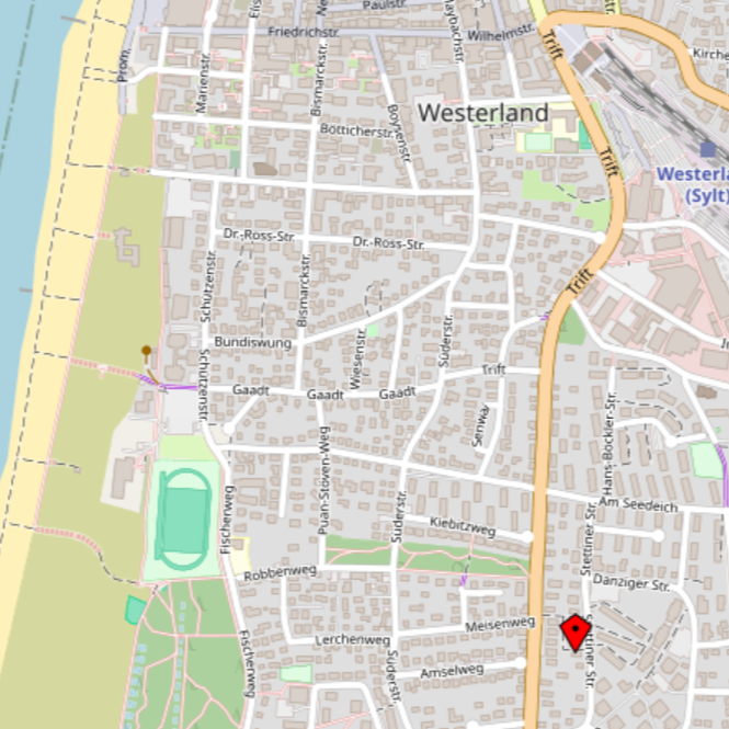 Unser ruhig gelegenes Haus befindet sich im Süden von Westerland in der Stettiner Str. 26. Zum Strand oder Bahnhof sind es ca. 900 Meter. Den Fahrradverleih und den Bäcker erreichen Sie "um die Ecke".