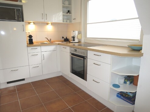 Ausreichend Geschirr, Kühlschrank mit Gefrierfach, Ceran-Herd, Backofen, Mikrowelle/Grill, Geschirrspüler, Kaffee- und Nespresso-Maschine, Milchschäumer, Wasserkocher, Toaster, Rührmixer, Kinderhochstuhl.